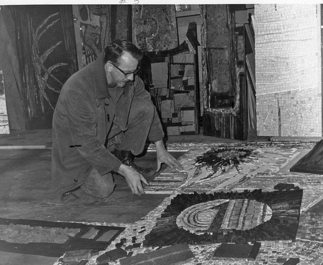 Reinhold Marxhausen's approach to both of the mural mosaics he did for the Nebraska State Capitol was as unique as were his subjects. Marxhausen was really nontraditional: he glued the tiles directly to plywood panels. He used ceramic and glass, as well as hardwood flooring. He fit the pieces together so tightly that he didn't need to add grouta type of glue in between them.