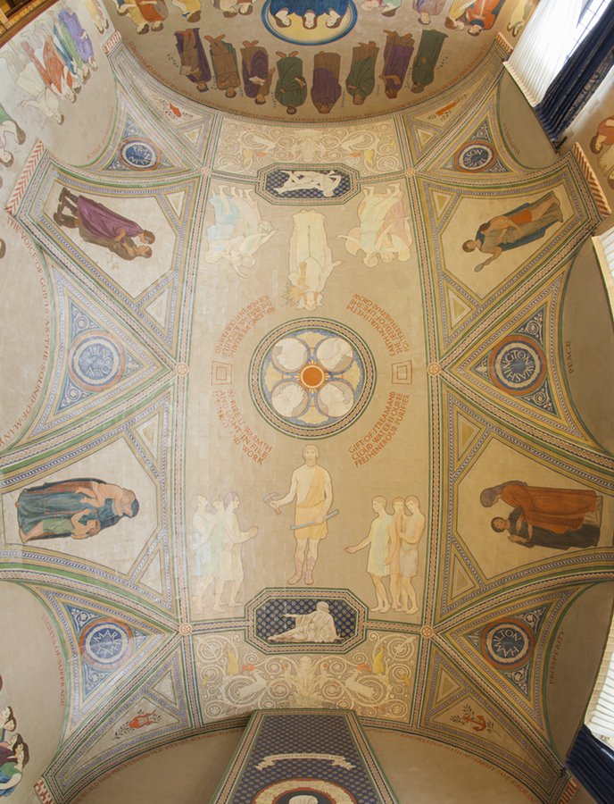 The artist of the ceiling murals, Augustus Vincent Tack, chose a gothic (from Europe around the year 1400) style of dress to portray citizens. Tack decided not to use modern clothing so that the figures would appear timeless and never go out of style.