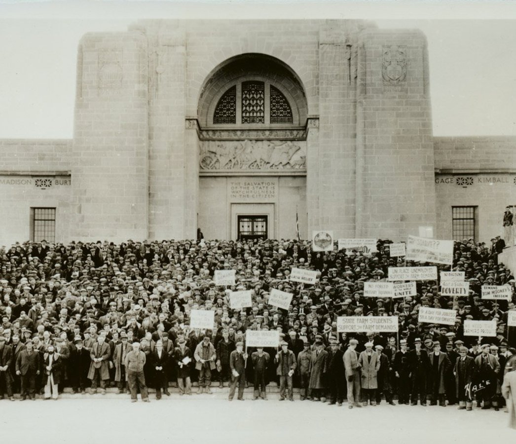 One of the first protests happened in 1933, when the Farm Holiday Association marched on the State Capitol to demand that the legislature put a hold on farm foreclosuresthe legal process that banks use to get back some of the money they loaned when a borrower can't repay the loan for two years.