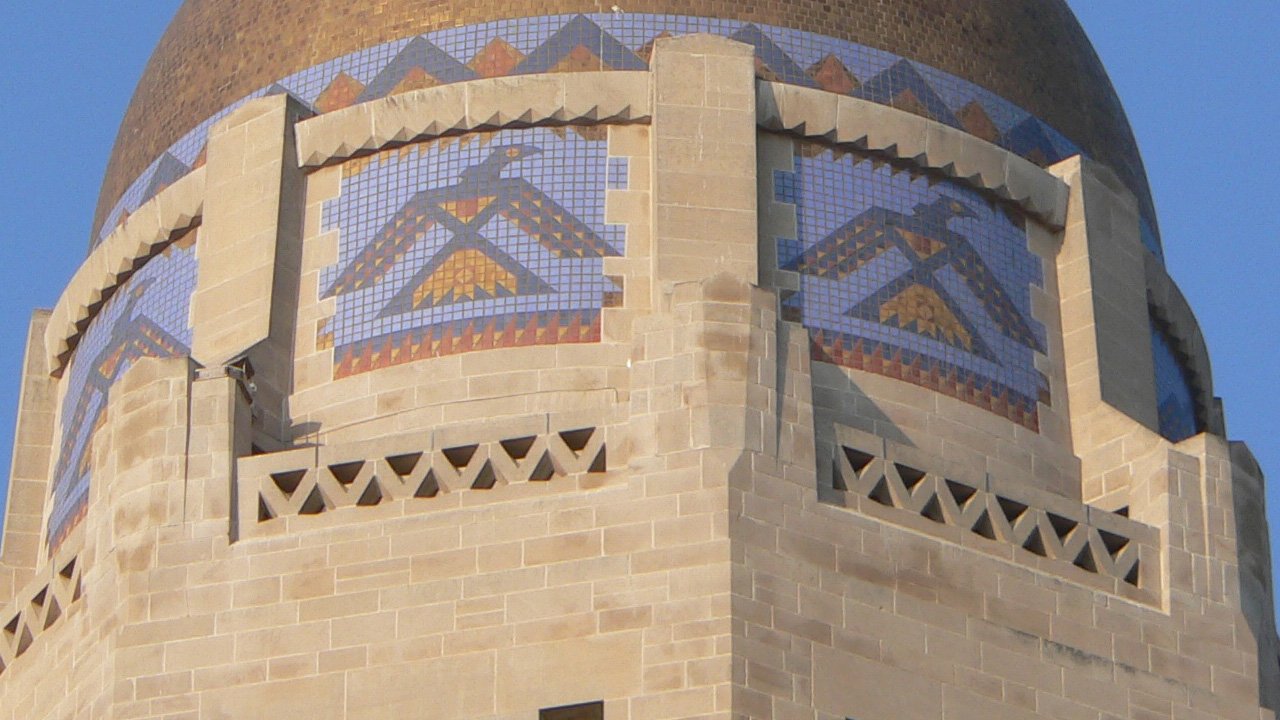 The thunderbird is a Native American symbol. The thunderbird was believed to bring the rain on its back, and make the thunder with its wings. So eight thunderbirds ring the top of this tower, reminding you of the importance of rain to Nebraska.
