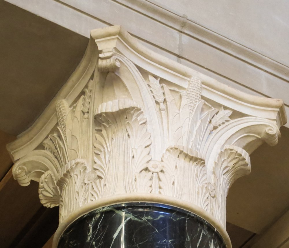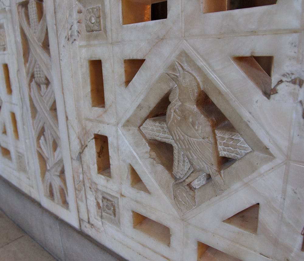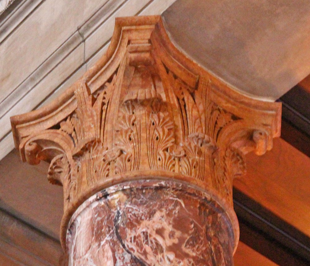 The onyx railing around the Rotunda has carvings of a bison skull and the state bird, the Western Meadowlark. In between these carvings are tall caved panels with corn.