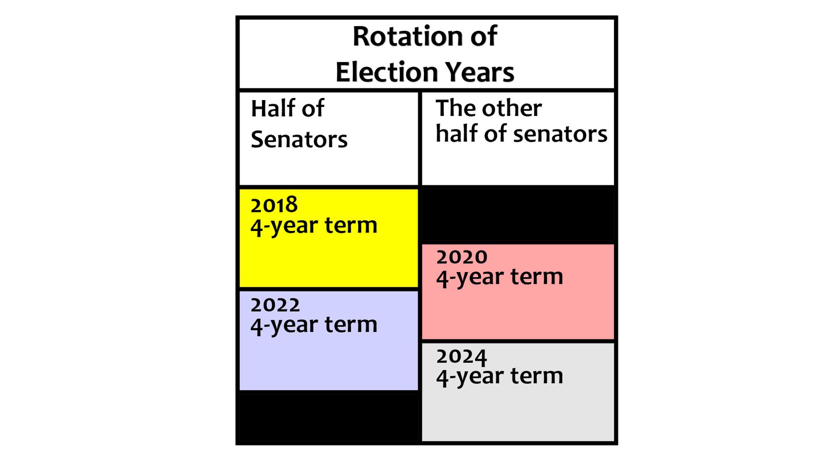 - Senators are elected to four-year terms.