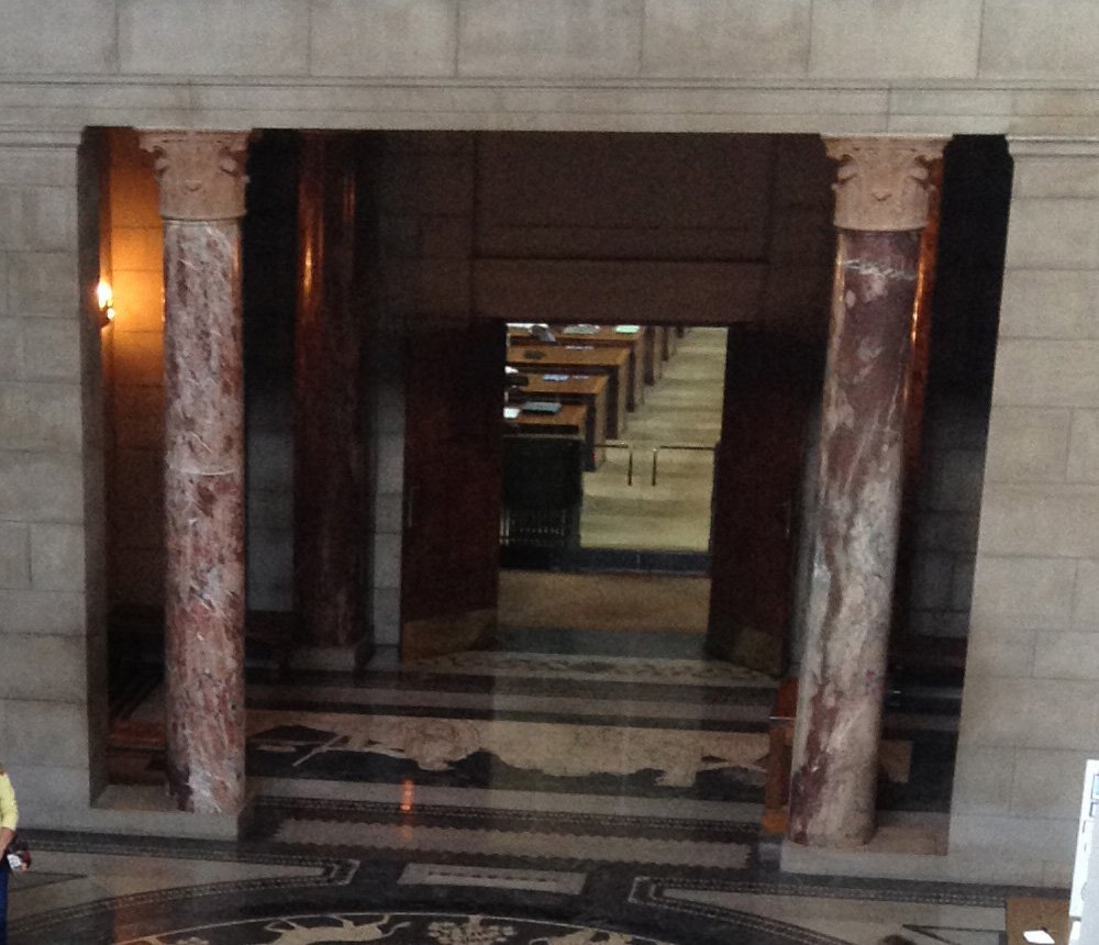 Go to the North Façade to find out more about how people got here. Today, representativesPeople elected to the legislature to present the ideas and carry out the will of the people in their assigned area. from all parts of Nebraska meet here in one room, in one house.