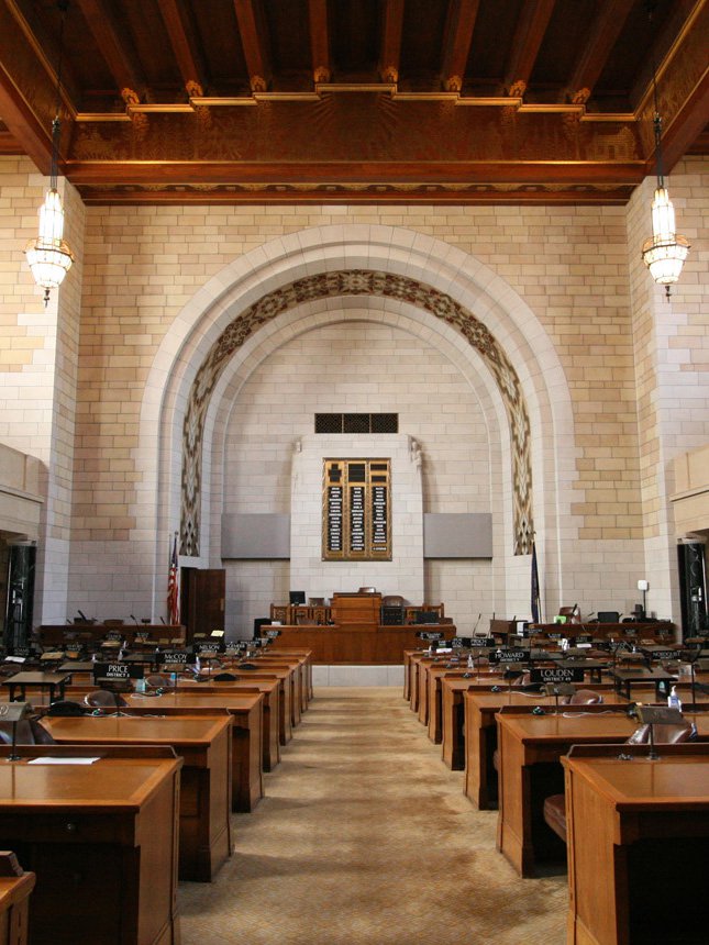 Besides having just one house, the Nebraska Legislature has another unique feature-- it's nonpartisanNot belonging to any political party.. Senators are supposed to forget their political party affiliationsConnections or membership. when they're in this room. The senators answer to the people instead of to a party, so senators from all the political groups are better able to cooperate.